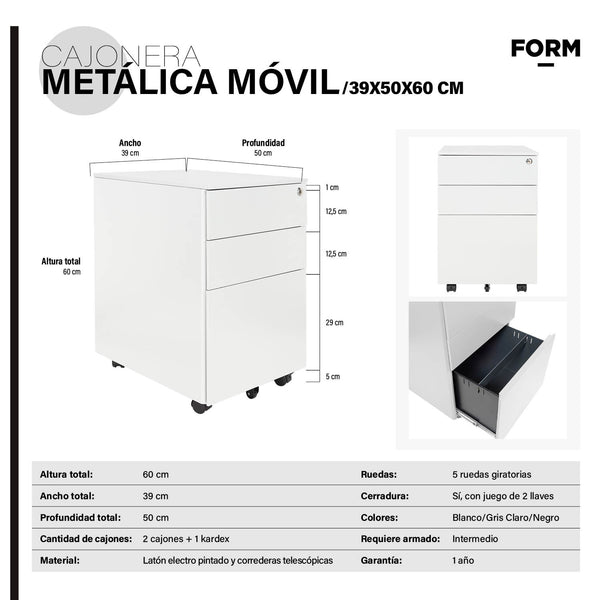 El complemento ideal para tu oficina. Cuenta con 2 cajones + 1 kardex podrás optimizar el orden de tu escritorio, además posee una cerradura bajo cubierta para mayor seguridad. Excelentes terminaciones y materiales especiales para alto tránsito, estructura de latón electro pintado y correderas telescópicas.