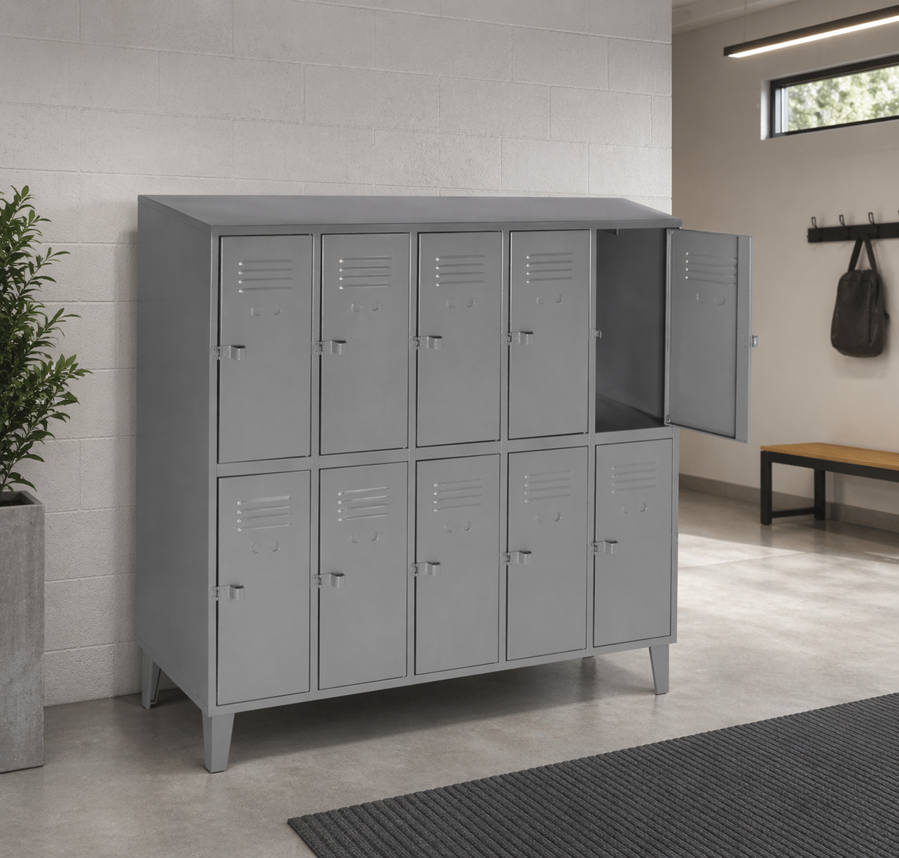 Máxima capacidad de almacenamiento para espacios de alto tráfico. Ideal para empresas, industrias, bodegas, colegios, gimnasios y camarines que necesitan orden, seguridad y funcionalidad en un solo producto. Fabricado en acero resistente, con 10 compartimentos independientes para uso personal o laboral.