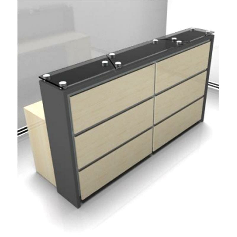 Mueble para recepción diseño especial con cubierta principal de trabajo, sobrecubierta en cristal. Puede ser solicitado con cajoneras móviles o, algún mueble de apoyo. Puede ser solicitada con o sin sobrecubierta de cristal.